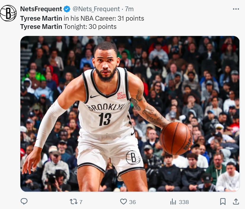 末节两队开启对攻大战,KD还在场下休息,拿双向合同的泰雷斯-马丁三分再中(第六个)打停太阳,泰雷斯-马丁还在命中三分,三分3中3拿到9分1篮板;沃特福德也命中三分帮助篮网在最后1分14秒还领先11分,沃特福德的三分等于是杀死了比赛。