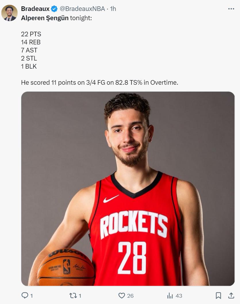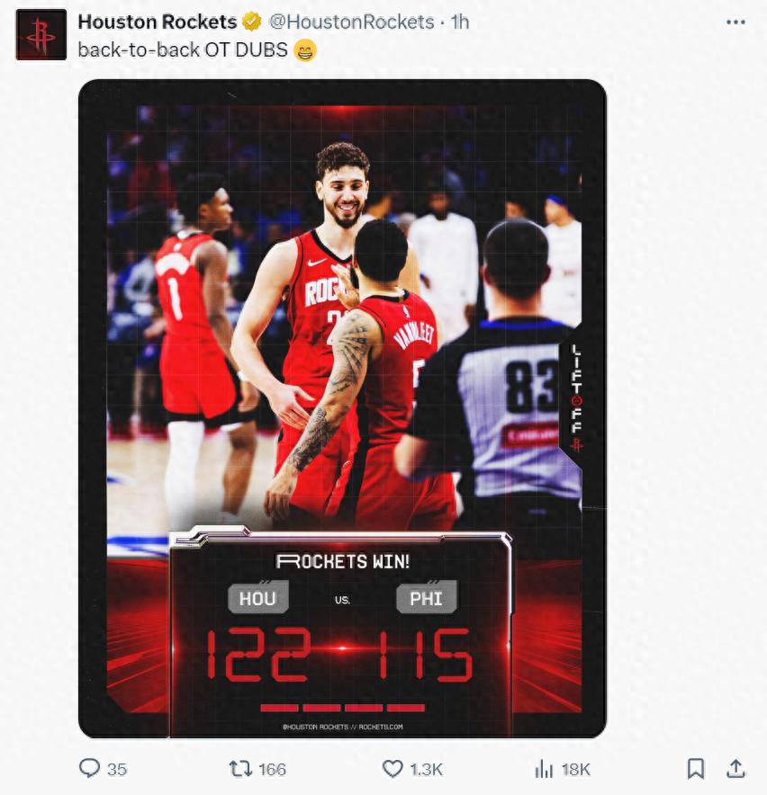 火箭122-115拒绝费城逆转拿下二连胜,背靠背两场都打到加时赛,加时赛都是依靠阿尔佩伦-申京的篮下统治力拿下胜利,申京这两场比赛的发挥得到了外界的认可,他拿到五年1.85亿的续约合同也被看作是廉价续约火箭赚翻。