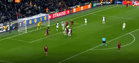 第19分钟,迪巴拉开出前场左路任意球到禁区内,恩迪卡前点甩头攻门,球击中横梁下沿后弹入网窝,罗马扳平,1-1!