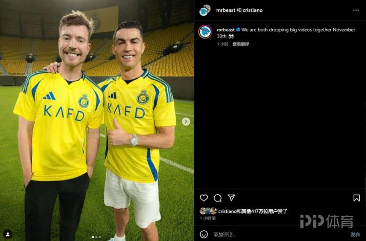 C罗和YouTube第一网红Mr Beast(野兽先生)在社交媒体上晒出合照,并表示两人将在11月30日合作推出重磅视频。