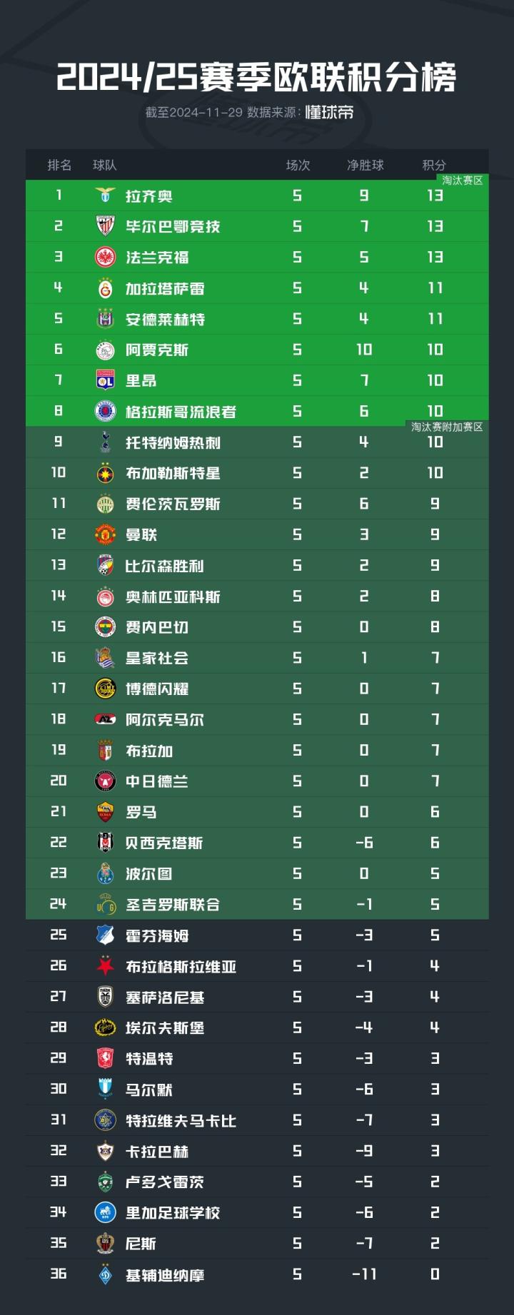 北京时间11月29日凌晨,2024/25赛季欧联杯联赛阶段结束了第5轮的全部较量,积分榜的形势也产生了进一步的变化。