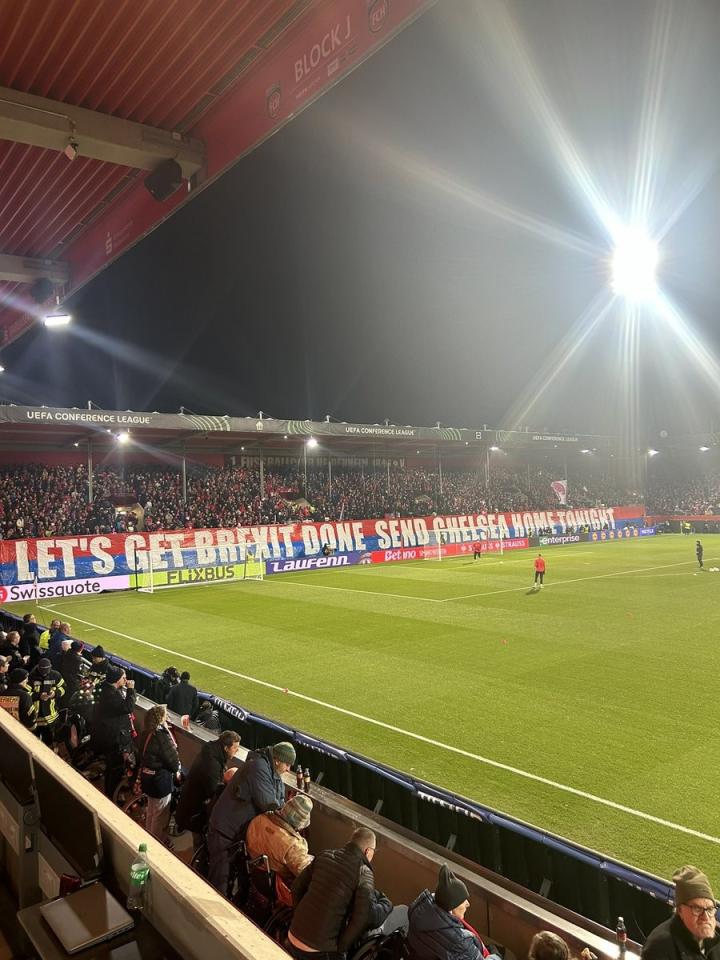 横幅上写道:“让脱欧完成,今晚送切尔西回家。” 这一标语借用了英格兰脱欧时期的经典口号,表达了海登海姆球迷对主队取胜的期待。