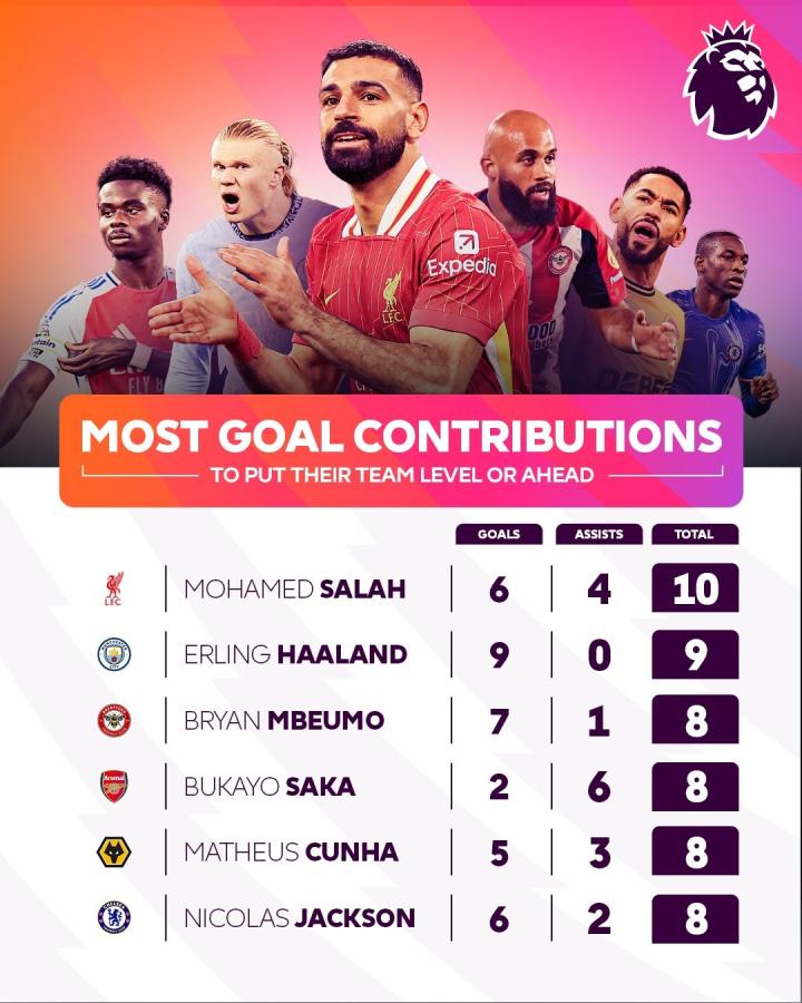 英超官方列出了本赛季英超球员参与帮助球队取得领先或扳平比分进球排行,萨拉赫以10球居首,哈兰德以9球排名第二。