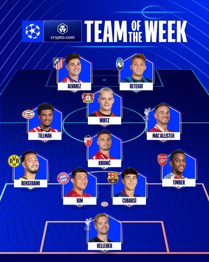 欧冠联赛阶段第5轮比赛战罢,欧冠官方公布了本周最佳阵容,阿尔瓦雷斯、库巴西、金玟哉、凯莱赫等人在列。