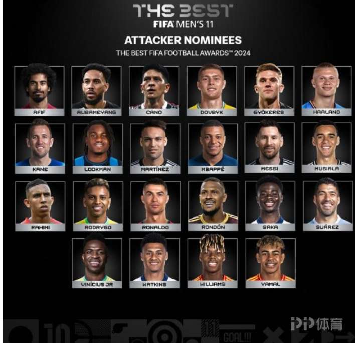 阿菲夫(卡塔尔)、奥巴梅扬(加蓬)、卡诺(阿根廷)、多夫贝克(乌克兰)、哲凯赖什(瑞典)、哈兰德(挪威)、凯恩(英格兰)、卢克曼(尼日利亚)、劳塔罗(阿根廷)、姆巴佩(法国)、梅西(阿根廷)、穆西亚拉(德国)、拉希米(摩洛哥)、罗德里戈(巴西)、C罗(葡萄牙)、隆东(委内瑞拉)、萨卡(英格兰)、苏亚雷斯(乌拉圭)、维尼修斯(巴西)、沃特金斯(英格兰)、尼科·威廉斯(西班牙)、亚马尔(西班牙)