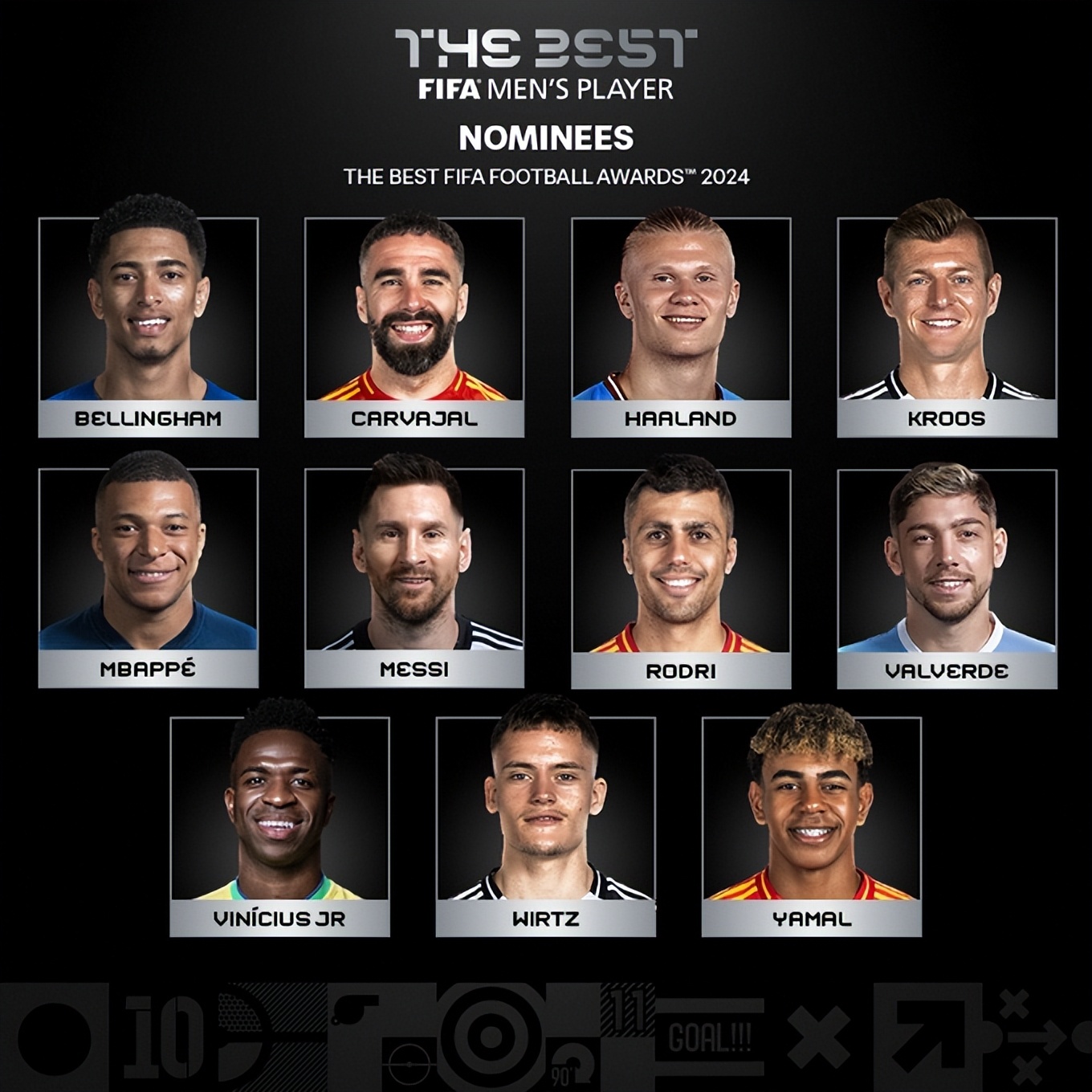 但不曾想,人在家中坐,喜从天上来,FIFA今天公布了2024年世界足球先生的最终11人候选大名单,梅西的名字赫然在列,一同入选的还包括:贝林厄姆、卡瓦哈尔、哈兰德、克罗斯、姆巴佩、罗德里、巴尔韦德、维尼修斯、维尔茨、亚马尔。