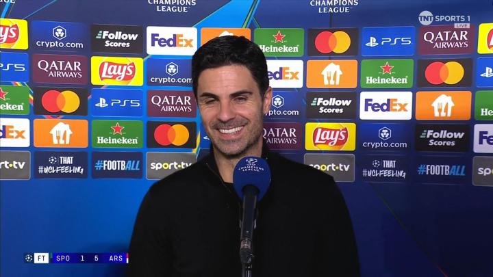 率队在欧冠联赛阶段第5轮客场5-1大胜葡萄牙体育之后,阿森纳主教练阿尔特塔接受了来自TNT体育的采访。