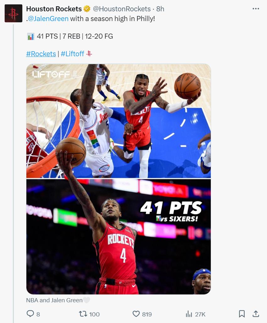 此役是格林生涯第八次拿下40+排在火箭后卫第三,仅次于哈登(98次)和麦克格雷迪(15次),如果格林能一直留在火箭打球超越麦迪很有希望。