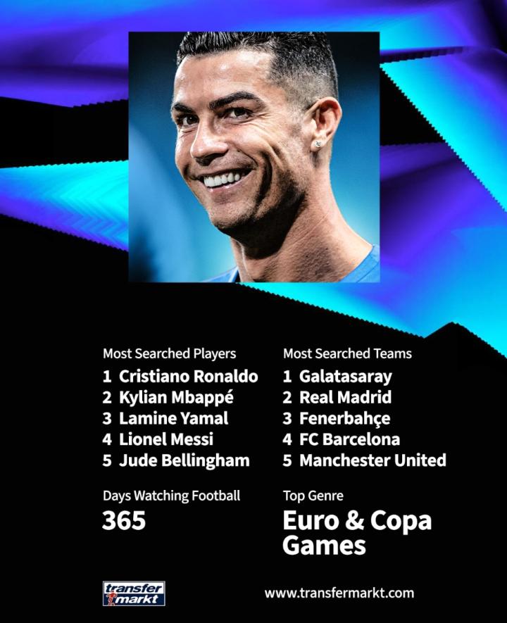 根据德国转会市场网站的年终盘点,C罗是2024年他们站内被检索次数最多的球员,而加拉塔萨雷则是被检索次数最多的球队。