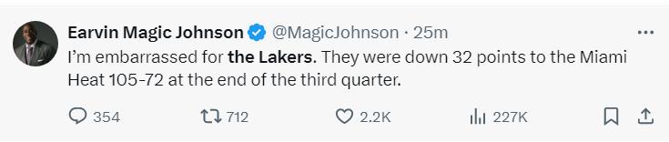 魔术师约翰逊:我为湖人感到尴尬,第三节打完时他们已经落后热火32分。