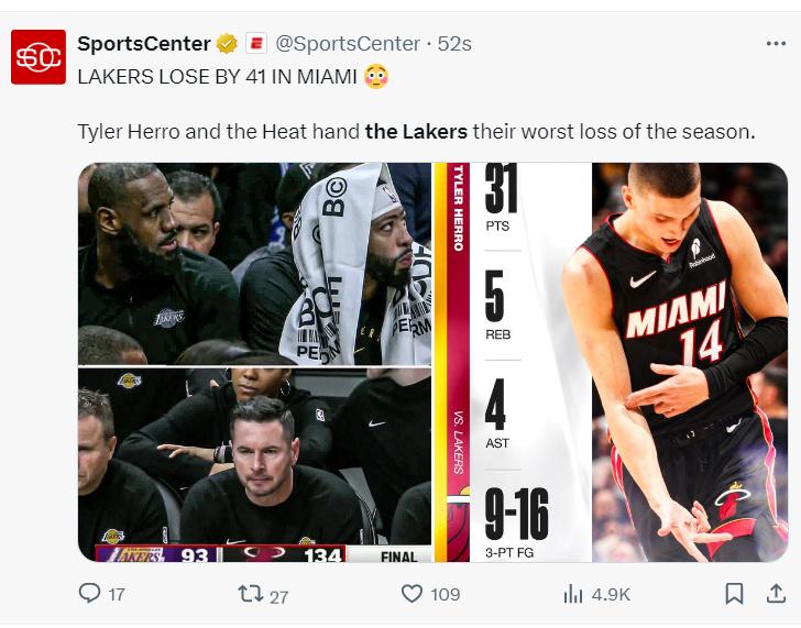 北京时间12月5日,湖人93-134惨败热火吞下二连败。这场比赛湖人在第三节崩盘,泰勒-希罗一人单节7个三分球直接射穿湖人防线,雷迪克不管是限制热火的内线还是外线都不成功,这是一场巨大的失利。