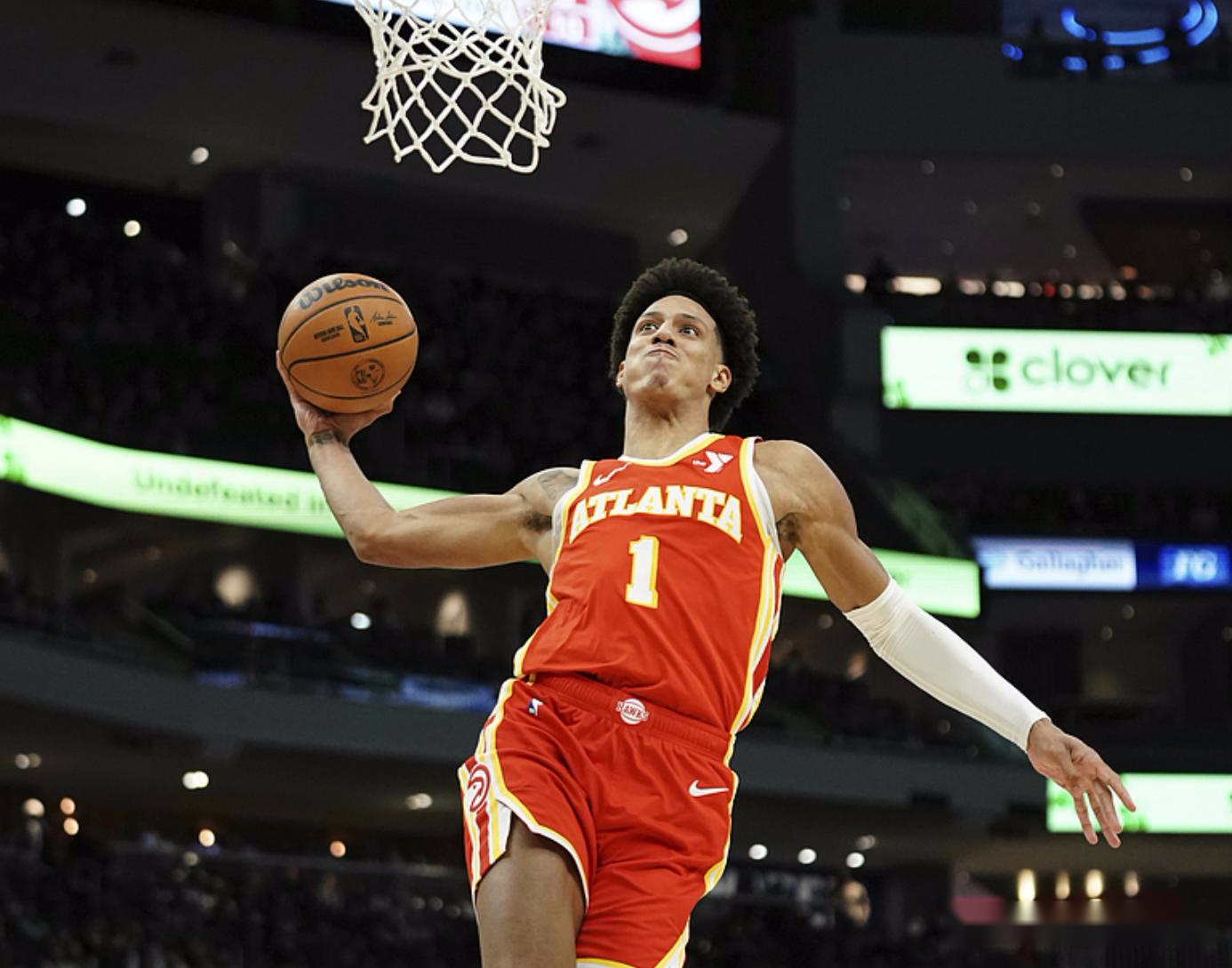 老鹰的杰伦-约翰逊表现出色,在老鹰vs雄鹿的比赛中,杰伦-约翰逊19中10,3罚3中,砍下23分13板5助攻2抢断1盖帽,带领老鹰以15分优势击败雄鹿,让字母哥砍下的31分11板5助攻沦为空砍。