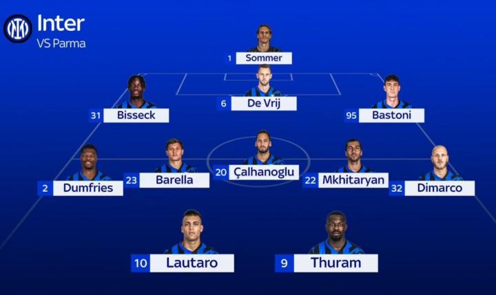 索默;比塞克、德弗赖、巴斯托尼;邓弗里斯、巴雷拉、恰尔汗奥卢、姆希塔良、迪马尔科;劳塔罗、马库斯-图拉姆