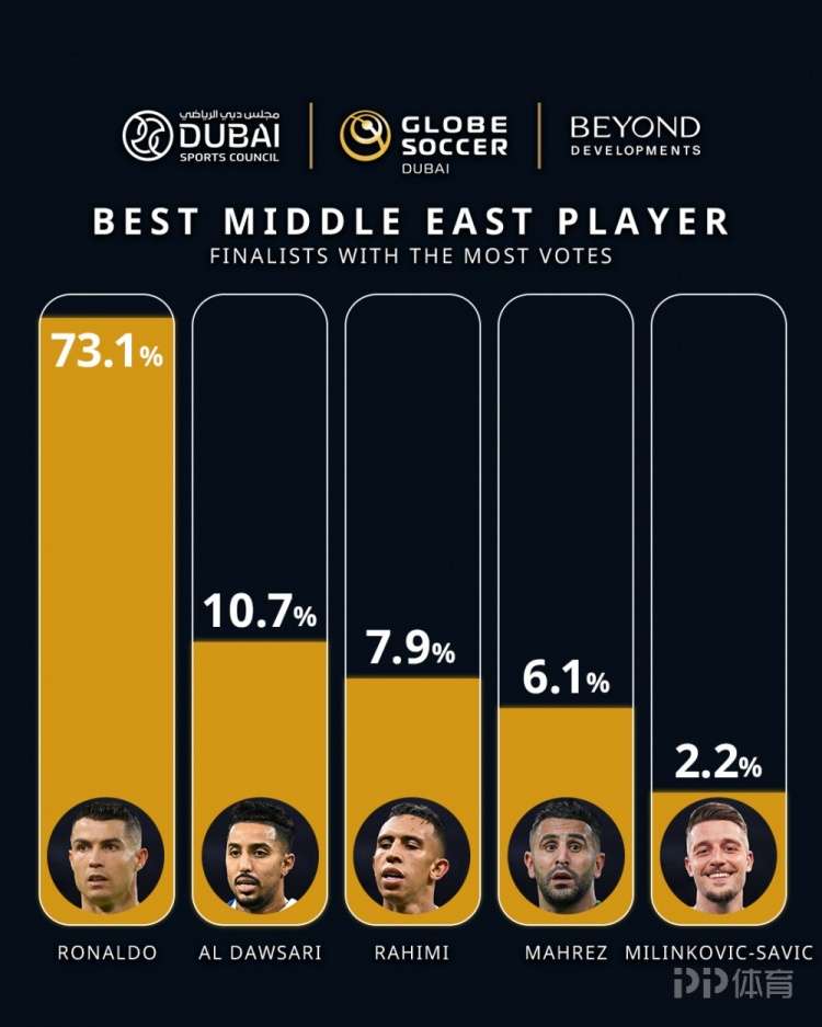 环球足球界晒出了最佳中东地区球员的投票情况,C罗以73.1%断层领先。环足奖官方评审团将参与最终排名的计算,并非完全由投票决定。
