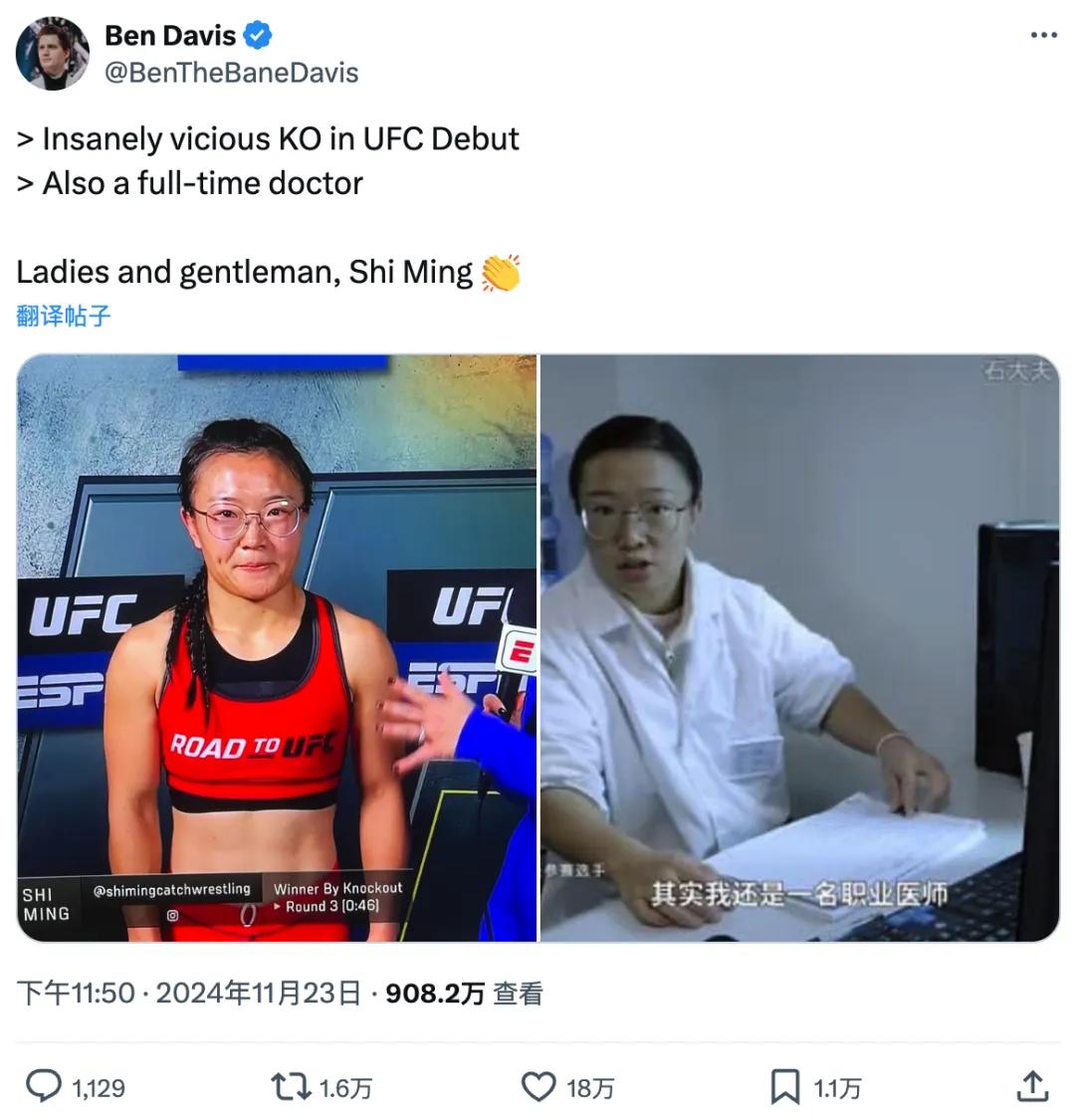 在接受采访时不止一次流露出害羞和紧张状态的“小女生”石铭,却是八角笼中的胜者。以一记扫踢KO对手的石铭,在一夜之间红遍了国内外的社交媒体。在海外社交媒体,UFC比赛解说Ben Davis发布的关于石铭的帖子点赞超过18万,在国内的社交平台,石铭被各大主流媒体争相报道。