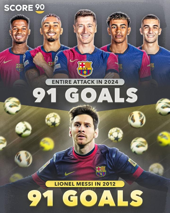 据统计,2024年巴萨5名前锋已经打进了91球,与2012年梅西的单年度91球进球纪录相当。