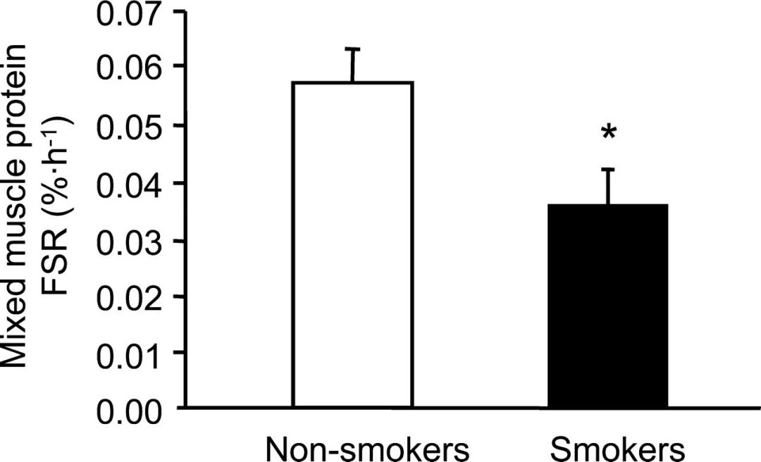 因此两组人虽然体内亮氨酸水平(原料)相仿,但是肌蛋白合成速率有明显差异,上图左侧为非吸烟者,右侧为吸烟者, 两者的肌肉蛋白合成率相差37% 。