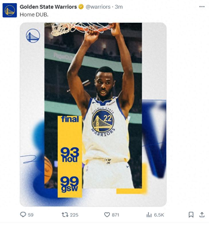 北京时间12月6日,休斯顿火箭队以93-99不敌金州勇士队,勇士结束5连败,火箭面对勇士则已经吞下跨赛季的15连败。这场比赛安德鲁-威金斯是为勇士奠定胜局的大功臣,他第二节两个3+1引爆主场,库里都为他摇旗呐喊。勇士队官方的海报是威金斯,说明他们认为威金斯才是最关键那个。