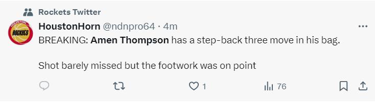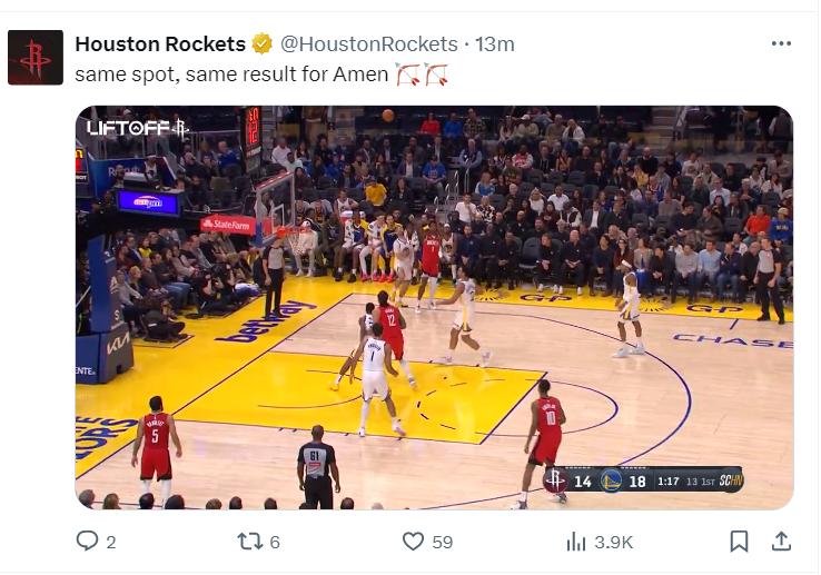 阿门登场时候还剩4分钟,这时候火箭落后,他登场就命中一个底角三分,随后接谢泼德传球又中一个底角三分。