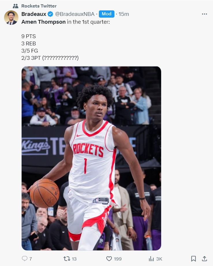 首节阿门4分钟,5中3+三分3中2拿到9分3篮板,他帮助火箭立马完成反超,阿门这个攻防效果拔群。