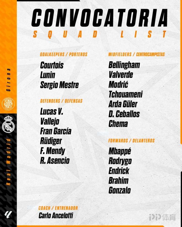 北京时间12月8日凌晨4:00,2024-25赛季西甲联赛第16轮,皇马将客战赫罗纳。赛前,皇马官方公布了球队本场比赛的阵容,姆巴佩继续领衔锋线,维尼修斯缺席。