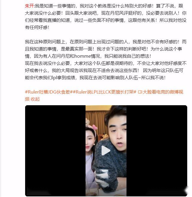 朱开没有直接爆料Daney到底犯了什么原则性问题,让他很生气,但是观众们的胃口已经被吊起来了。回顾到世界赛期间朱开曾经直播怒斥:LPL有一支战队,在和LCK战队打训练赛的时候,用了LPL的战术,暴露了LPL的战术储备。