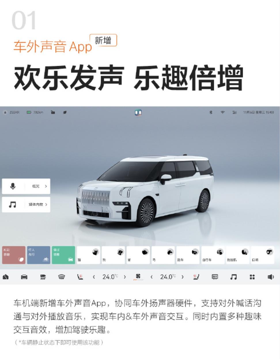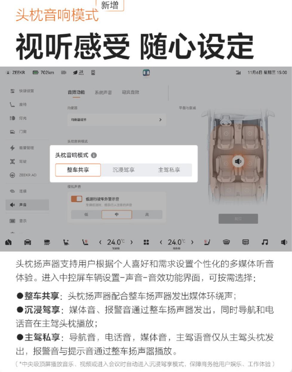 新增了车外声音App,可以通过车机端对外喊话和播放音乐、头枕音响模式,可选整车共享、沉浸驾享和主架私享三种模式。