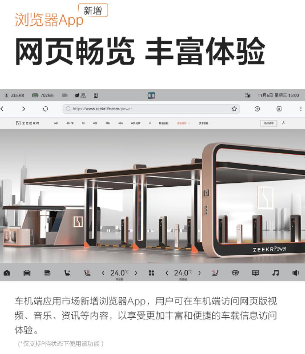 车机端新增浏览器App、新增导航预计到达时间显示、360度全景影像界面折叠后视镜按钮。