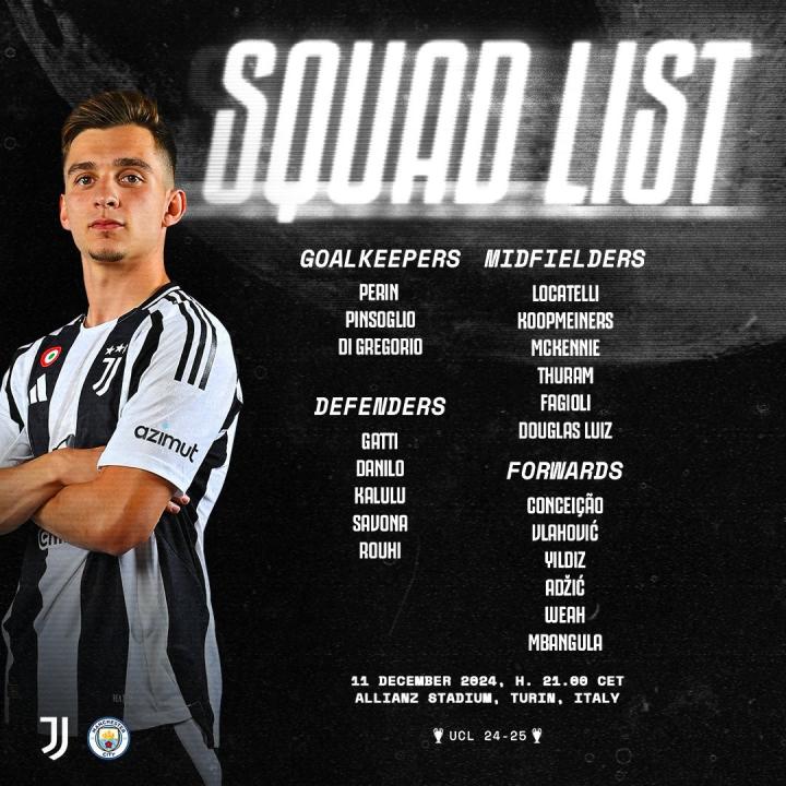 北京时间周四凌晨4时,尤文图斯将会在欧冠联赛阶段第6轮的比赛中坐镇主场迎战曼城,赛前蒂亚戈-莫塔公布了他们本场比赛的大名单,后防线上安德烈亚-坎比亚索受伤缺阵之后仅剩5人入选,不过好消息是麦肯尼和道格拉斯-路易斯伤愈归队。