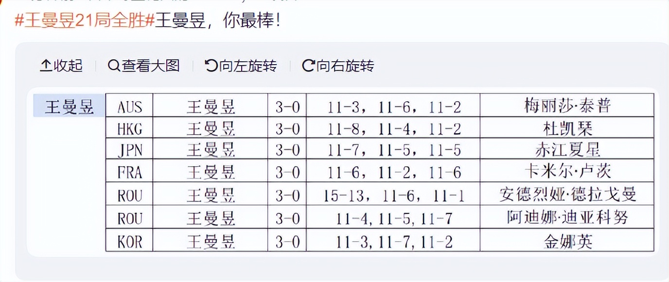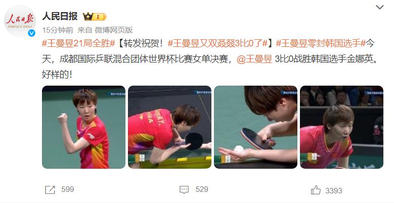 赛后人民日报写道:祝贺王曼昱21局全胜,王曼昱又双叒叕3比0了。王曼昱零封韩国选手金娜英,成都混团世界杯女单决赛又是王曼昱赢球。