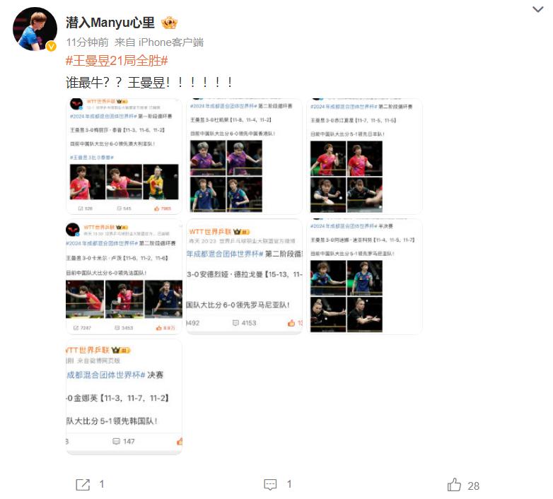 王曼昱的球迷写道:王曼昱21局全胜,实在是太牛了。