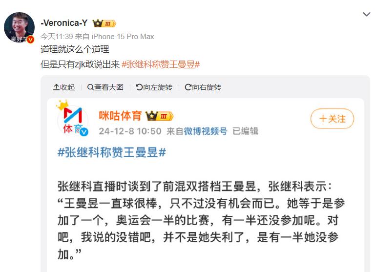 在这场比赛之前,张继科在直播间这样评价前混双搭档王曼昱:“王曼昱打球一直很棒,只不过没有机会而已。她等于是参加了奥运会的一半比赛,有一半没打。她并不是失利了,而是她有一半没参加。”