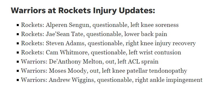 火箭:亚当斯,出战存疑,右膝伤势恢复;