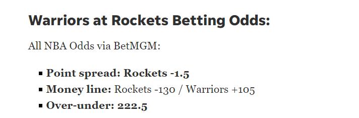 根据BetGM的分析,火箭让-1.5,赔率方面火箭-130,勇士+105,很明显火箭是完全压制勇士的,外媒是疯狂看好火箭结束15连败,结束长达1757天不胜勇士的魔咒。