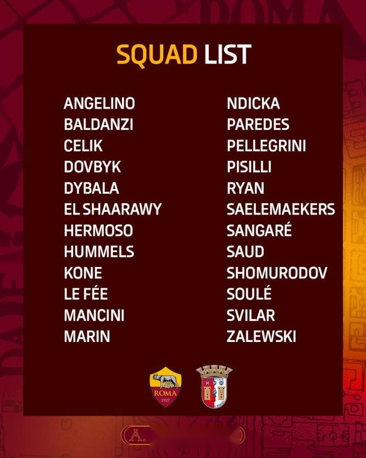 北京时间周五凌晨01:45,上周末刚刚终结6场不胜和意甲4连败的罗马将会在欧联杯联赛阶段第6轮的比赛中坐镇主场迎战葡超劲旅布拉加,赛前拉涅利公布了红狼本场比赛的大名单,此前因流感缺阵的多夫比克回归。