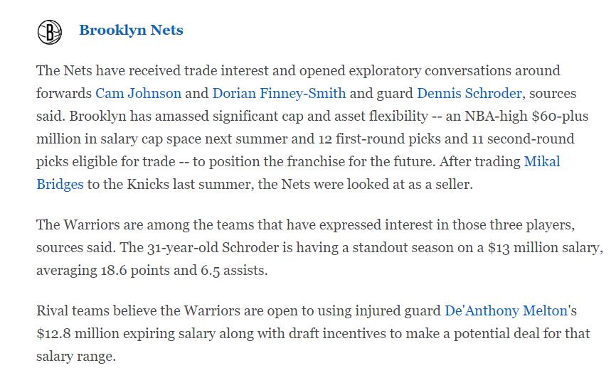 布鲁克林篮网队愿意交易芬尼-史密斯、卡梅伦-约翰逊、丹尼斯-史密斯,篮网有意在明夏清理出6000万的薪金空间,12个首轮签与11个次轮签可以重铸未来。交易掉布里奇斯后他们有很多未来资产。