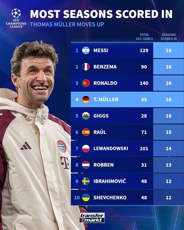 随后,德国转会市场列出了欧冠进球赛季最多的球员,其中梅西和本泽马均为18个赛季在欧冠进球,穆勒排名第四。