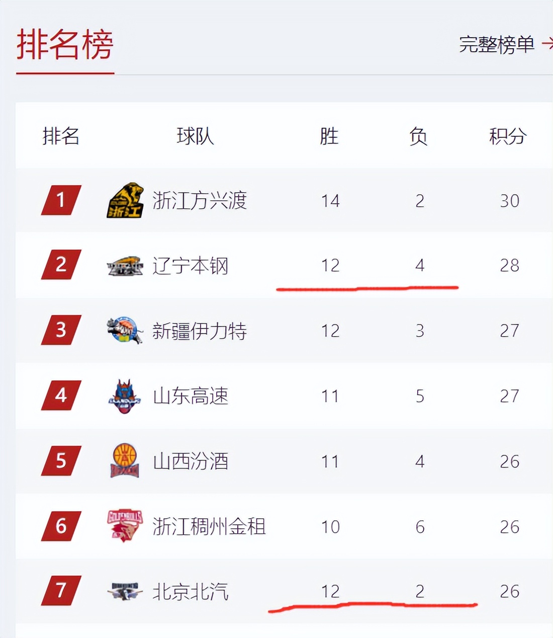 先来看看积分榜目前的排名,1-7名分别是广厦(14胜2负)、辽宁(12胜4负)、新疆(12胜3负)、山东(11胜5负)、山西(11胜4负)、浙江(10胜6负)以及北京(12胜2负)。怎样?看到这份排名,是不是大部分都感觉非常迷茫与别扭。北京队的战绩明明比浙江、山东、山西等队还要好,为何却只能屈居人下呢?他们无论是胜场,还是胜率,都是前四名的水准,可为何却只能排在第7名呢?