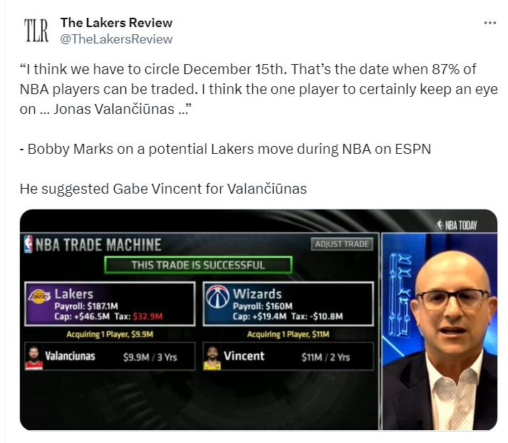 ESPN薪资结构专家讨论湖人得到瓦兰的交易方案时,他认为湖人可以用文森特+多个次轮签换来瓦兰。