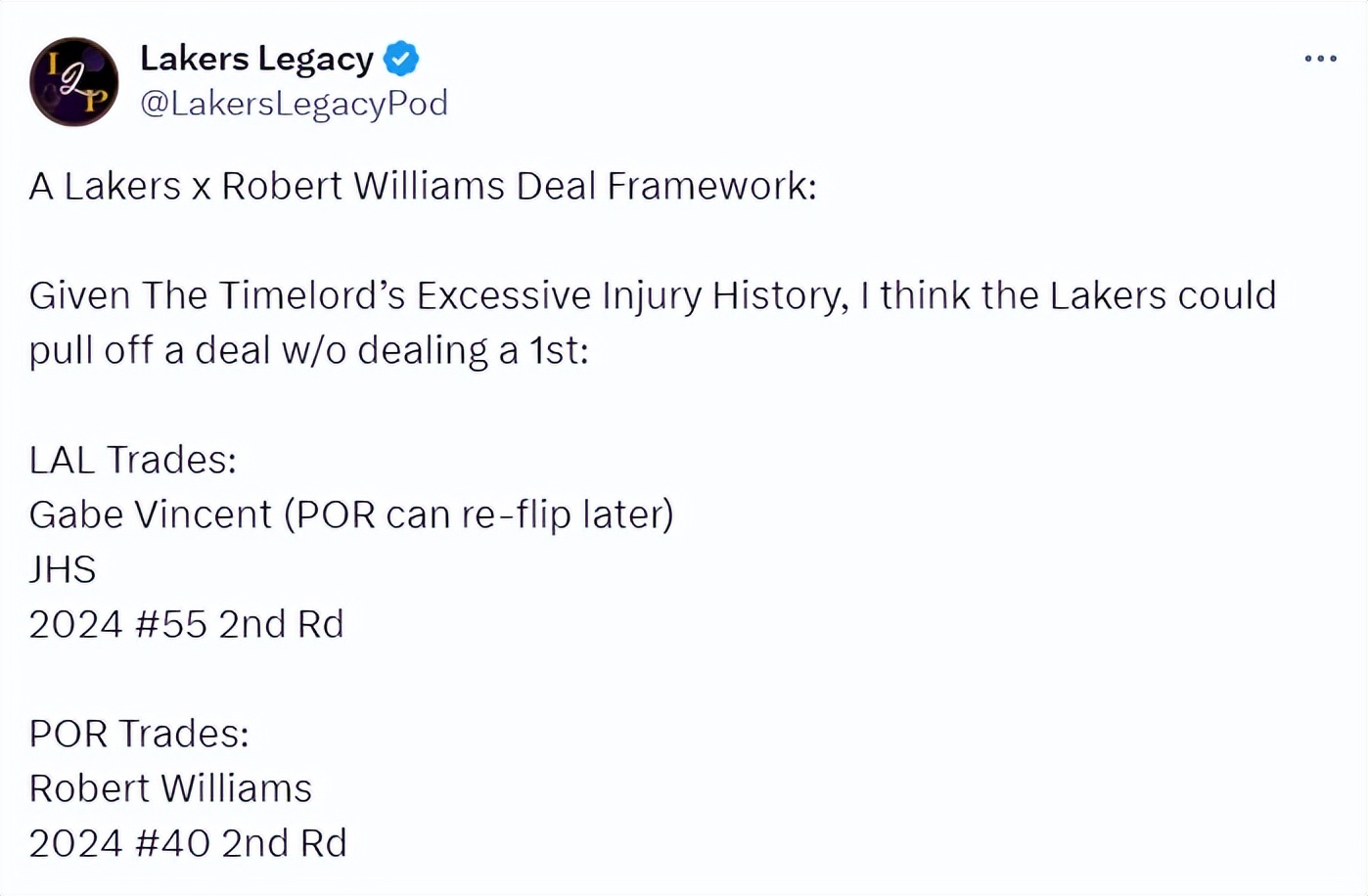 湖人媒体Lakers Legacy模拟了交易得到罗威的方案:文森特、希菲诺、24年55号签换罗威、2024年40号签。