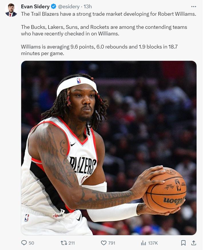除此之外,NBA记者埃文-斯迪瑞报道,开拓者已经将多人摆上货架,罗威本赛季场均18.7分钟拿到9.6篮板6篮板1.9盖帽已经引来湖人、雄鹿、太阳、火箭多支球队的争抢。