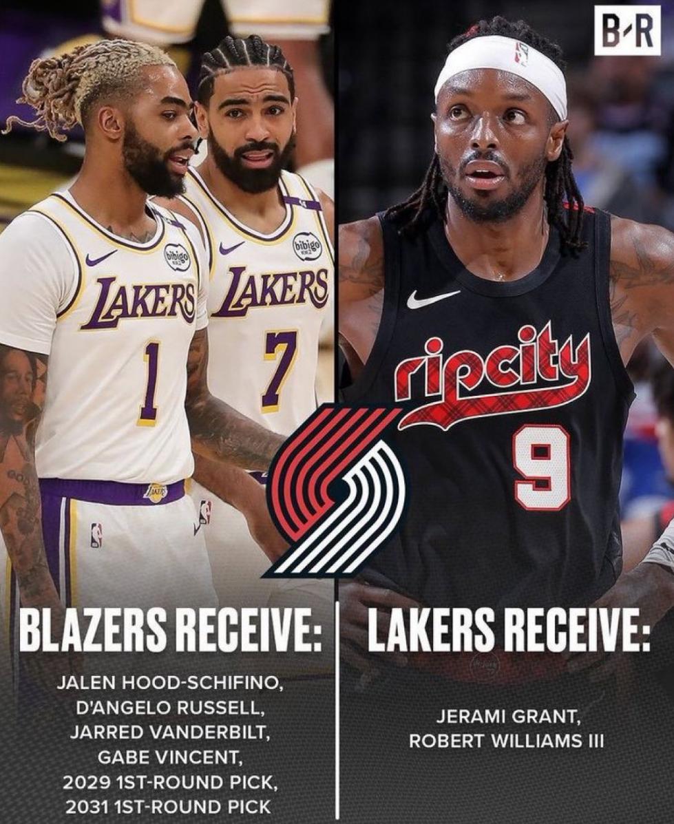 BR此前模拟过湖人/开拓者的大型交易,湖人送出希菲诺、拉塞尔、文森特、范德比尔特、29年首轮、31年首轮,得到格兰特、罗威。