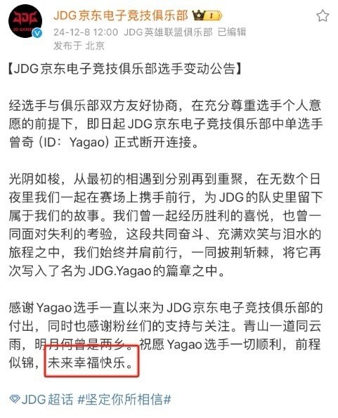 在Yagao本人宣布退役后,JDG官博也第一时间做出了更改,把“赛场见”改为了“未来幸福快乐”。Yagao当年就是在JDG打出了名气,后面离队后又再次回到JDG,相信他在JDG还是度过了很快乐的时光,双方的感情很深,这波专门更改官宣文案,JDG官博也用心了。
