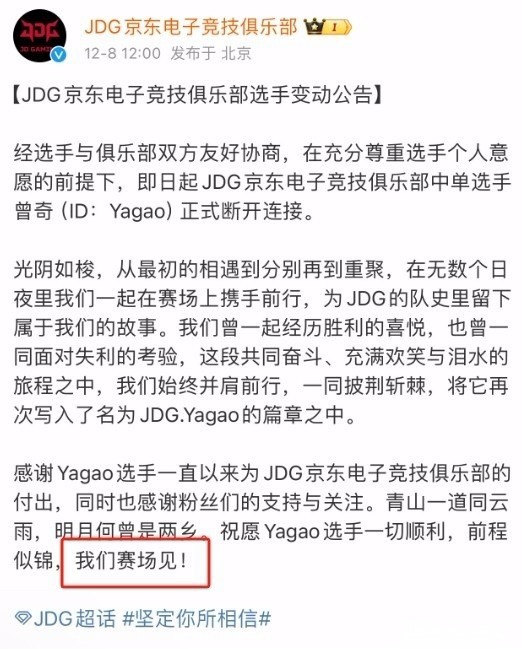 虽然之前有人爆料,但是Yagao突然自己出来宣布,还是让很多人有点意外。之前JDG官博官宣yagao离队的时候,用的是“赛场见”的告别语。