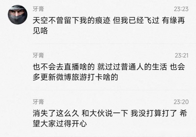 Yagao在粉丝群的发言如下,表示:自己不打算继续打了,希望粉丝们可以过得开心,未来也不会去做滞后波,会过普通人的生活,天空不曾留下我的痕迹,但我已经飞过,有缘再见。