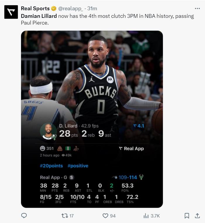 全场比赛利拉德38分钟,15中8,三分5中2,罚球10中10,拿到28分9助攻2篮板1抢断,命中率53.3%,真实命中率72.2%,他在关键时刻的三分命中数超越皮尔斯升至历史第四完成里程碑。