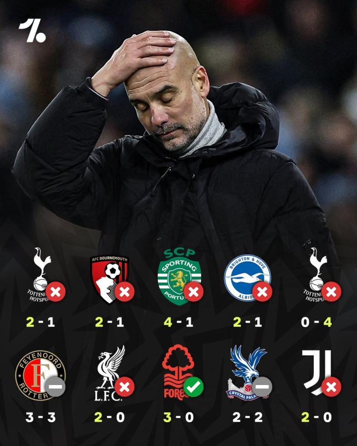 在欧冠客场0-2输给尤文图斯后,曼城各项赛事最近10场比赛只取得1场胜利,为英超3-0战胜诺丁汉森林,其余9场比赛战绩为2平7负。