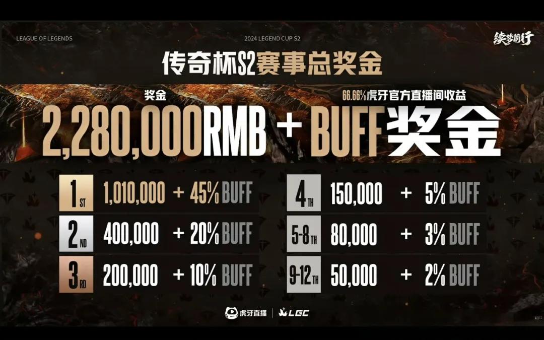 随着传奇杯队伍一起扩充的,还有传奇杯的奖金。在S1,10支队伍总计可以按成绩获得总计169万元人民币奖金。S2,不仅总奖金提升至228万元人民币,还新设置了buff奖金,金额是虎牙官方直播间收益的·66.66%,同样由各队伍按成绩划分。八个月时间、两届赛事、超过400万人民币的奖金,这充分展现了虎牙对于办好传奇杯的决心和实力。
