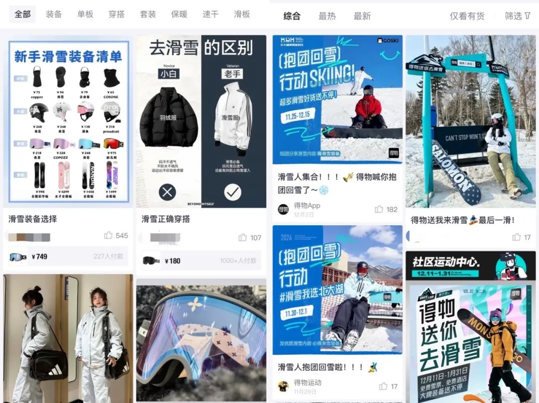 纵观互联网主流平台做滑雪内容的思路,滑雪内容焦点偏向「上雪后」的场景,侧重于硬核教学、滑雪记录以及雪场体验。 而在得物社区,用户们分享的滑雪内容,不仅在教学和体验,还聚焦在「上雪前」的细致准备阶段,涵盖了专业装备选择、滑雪技巧、玩雪怎么穿、冬季护肤知识等方面, 这一独特的视角为用户提供了贴心的雪前服务指南。