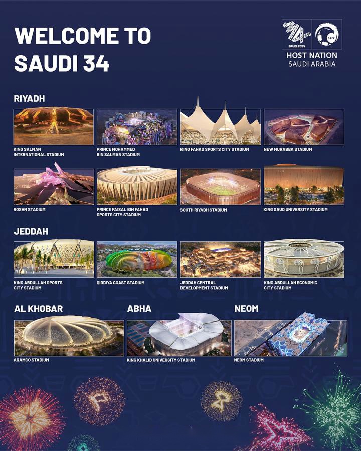 沙特足协官方消息,2034沙特世界杯将在15座球场举行,其中利雅得8座、吉达4座,胡拜尔、艾卜哈与NEOM新城各一座。